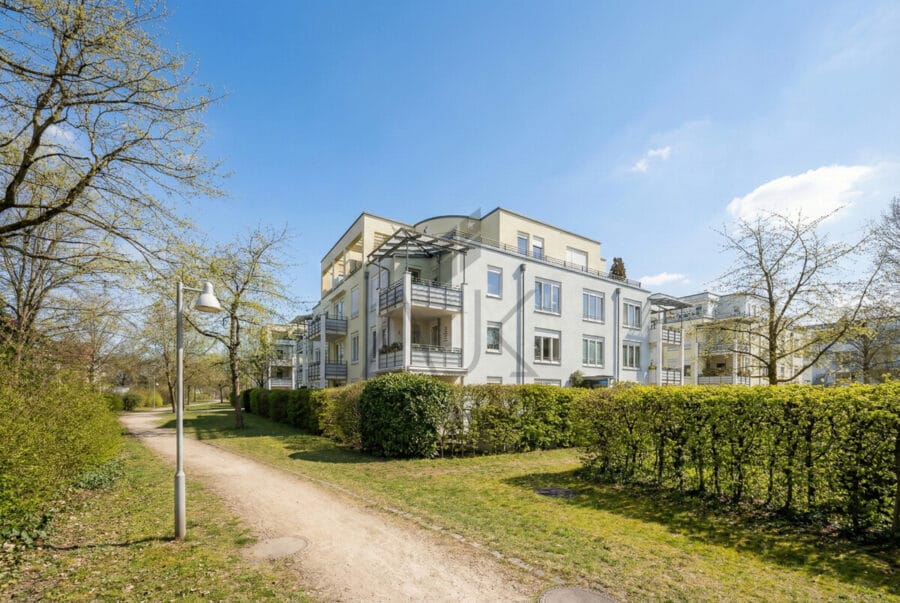 Die Lage der Wohnung ist besonders hervorzuheben: Sie befindet sich in absolut ruhiger Umgebung, eingebettet in ein parkähnliches Grundstück, das gemeinsam mit sieben weiteren Mehrfamilienhäusern ein harmonisches und gepflegtes Wohnensemble bildet. Insgesamt umfasst die Wohnanlage 120 Einheiten, verteilt auf acht Häuser, die zusammen eine gut strukturierte und solide verwaltete Wohnungseigentümergemeinschaft bilden.