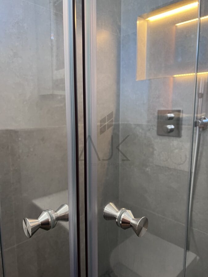 Neues Bad mit Waschtisch, begehbarer Dusche und Fenster